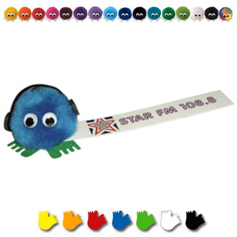 Logobug wearing a viking helmet Ribbon attached with your promotional message printed in full colour Large range of 44 pom pom colours and 7 different feet colours to choose from